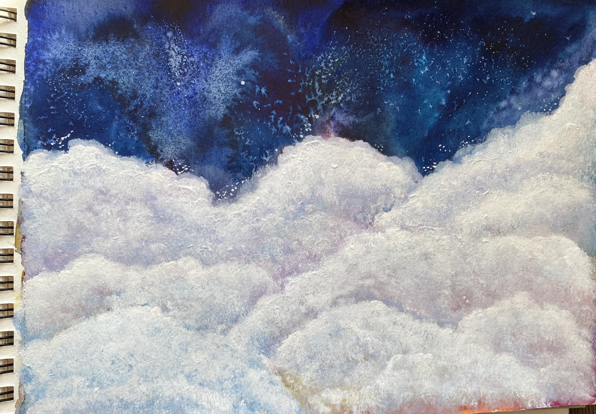 "Mystical Night Sky" watercolor, acrylic and gel pen. This is based on Ana Victoria Calderon's Skillshare class: "Watercolor and Mixed Media". This was also done in early January 2021. I think I used up the last of my white acrylic paint. I sprinkled salt on the night sky section while it was still wet to absorb the watercolor pigment and increase granulation, and the bloom effect. I also learnt the technique of tapping a filbert brush to form cloud shapes.