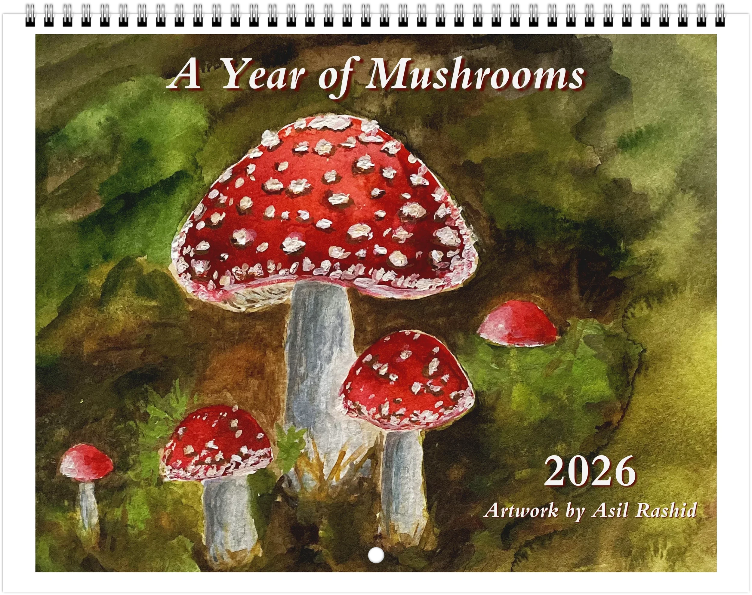 If you're a mycology enthusiast, you're going to love this calendar!!! The 2026 Wall Calendar "A Year of Mushrooms", is a collection of 12 mushroom illustrations, lovingly hand painted in watercolors by Asil Rashid. Each page showcases the mushroom that can be foraged during that month, comprising a combination of well-known favorites and others you may not have seen before! There are also some interesting tidbits of information included about each mushroom. The calendar is 8.5 x 11" which makes it a convenient size for any space in your home. Printed on premium 250 gsm coated silk paper with vibrant colors, a spiral binding in the center and a drilled hole for hanging.